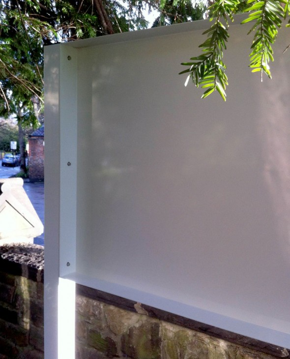 We have powder coated the full tray sign (front and back). The post has been mounted with 3 bolts on either side. This keeps the fixings to a minimum but gives the sign enough strength to withstand the elements. There are other options for this type of sign, which includes a backing tray panel, but this sign was a face tray only.