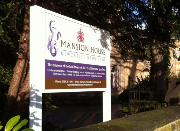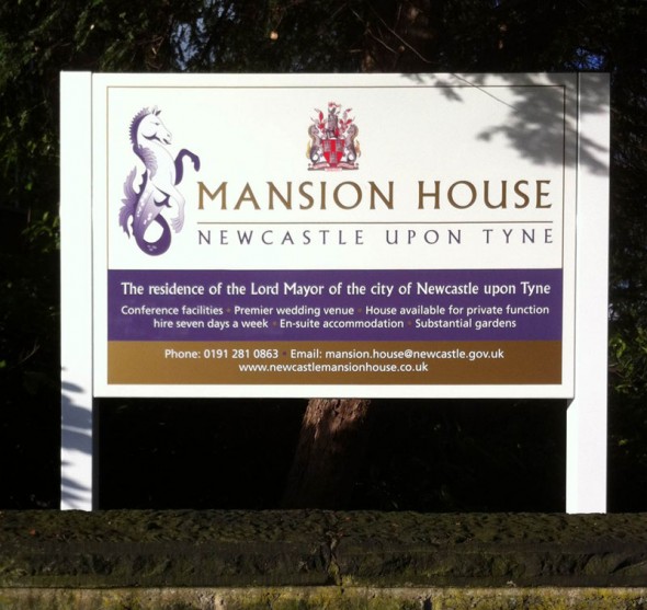 The Mansion House in Newcastle upon Tyne is “the residence of the Lord Mayor”. Any signage that had previously been in place was very subtle. There are a couple of existing brass plates on the stone columns on its entrance, but they are nearly invisible amongst the stonework.