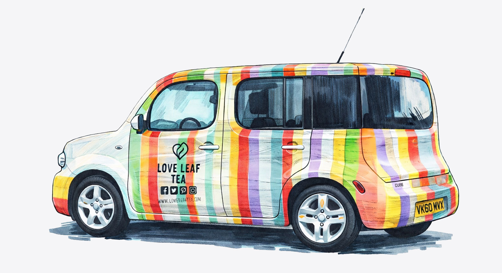 The concept came from the multicoloured background used on existing display boxes. Representing all the different varieties of tea. Love Leaf Tea’s packaging is in different colours per variety. So incorporating the vertical multicoloured stripes jumped out as the focus on the partial car wrap.